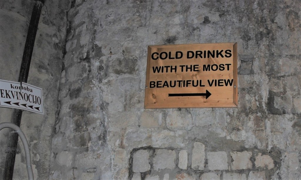 Most people know how to find the bars and they’ll point the way. It’s a bit challenging to find at night and they get crowded around sunset. To visit the original Buza bar climb the Jesuit Stairs from Gundulic Square. Turn left toward the wall & then right to keep following the wall. Look for sign Cold Drinks with the Most Beautiful View. Walk a short distance then enter a narrow arched door through the wall and step onto the cliffs.